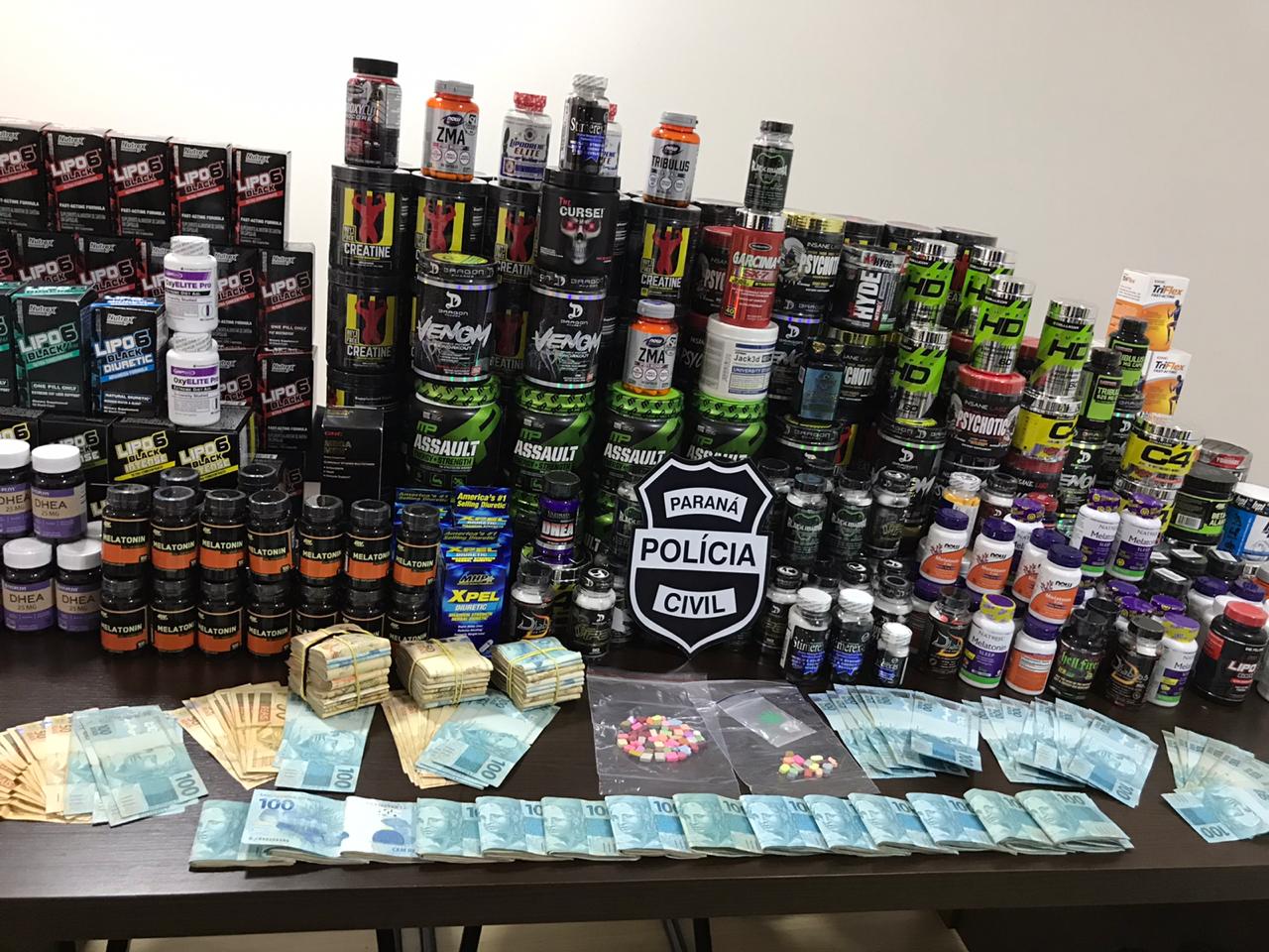 A Polícia Civil fez uma operação, nesta quarta-feira (8), em lojas de suplementos de Curitiba para apreender produtos falsos ou de venda proibida no Brasil. Os policiais cumpriram mandato de busca e apreensão em sete locais, sendo três lojas de suplementação de academia e quatro residências. Com um dos suspeitos, também foi encontrado drogas e ele foi preso em flagrante por tráfico de drogas.