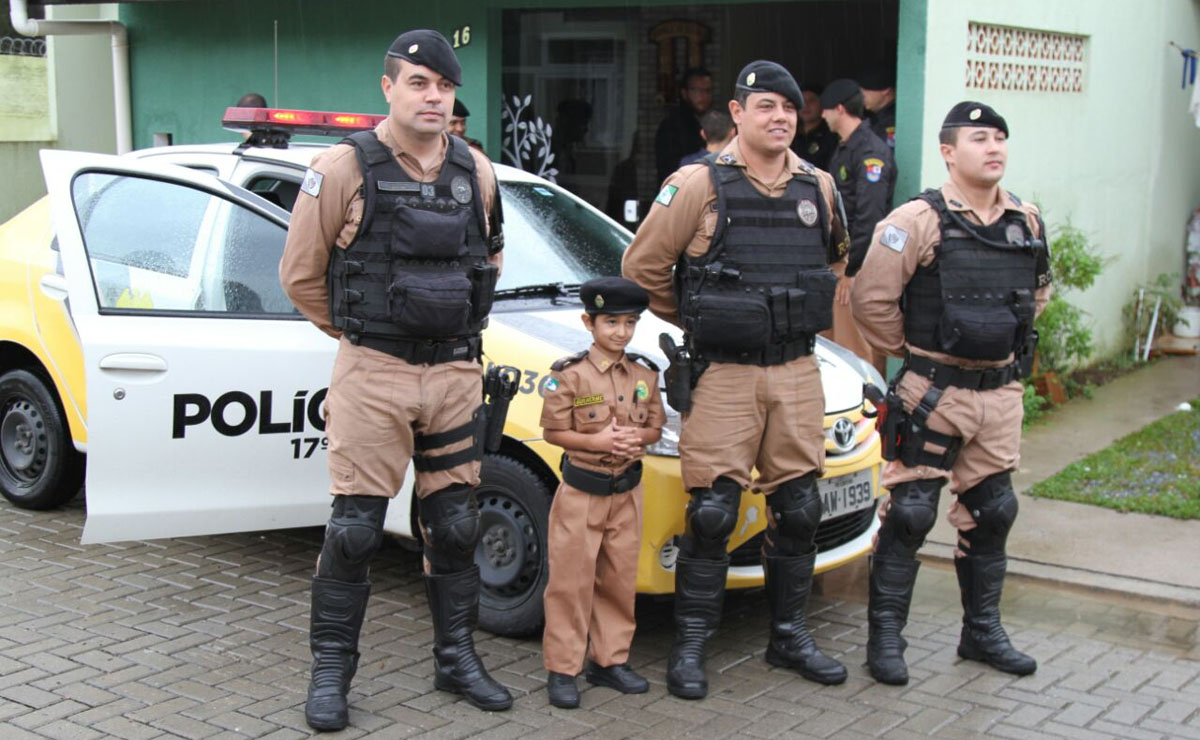 Farda bem passada, boina preta na cabeça, botina no pé, sirene ligada e… um bolo de aniversário. Foi assim que os policiais do 17º Batalhão da Polícia Militar (BPM) surpreenderam Guilherme Batista do Nascimento que, com apenas 6 anos, tem o sonho de ser PM. Nesta quarta-feira (27), o menino ganhou uma roupa da corporação e um aniversário na companhia da PM de Fazenda Rio Grande, Região Metropolitana de Curitiba (RMC).