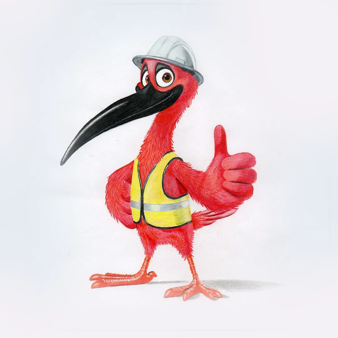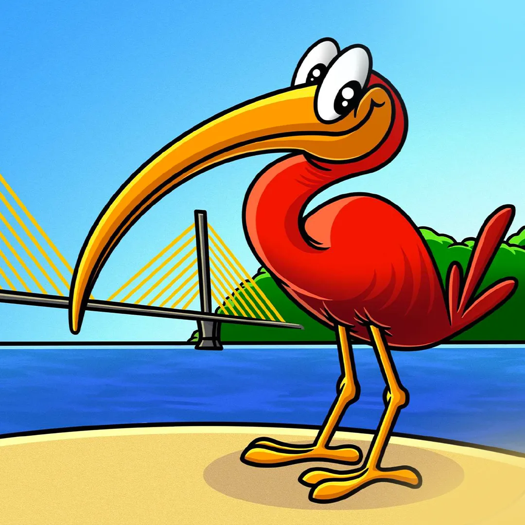 “O personagem surgiu através da pesquisa a respeito da Cidade de Guaratuba, da flora e fauna da região e da importância dessa ave como símbolo histórico. A principal inspiração foram os trabalhadores da obra da ponte. O desenho foi feito a mão usando lápis aquarelável. Eu visualizei o personagem como um trabalhador, um carinha carismático e alegre, comunicativo, aquele colega de trabalho que é legal e gentil com todo mundo, para criar um elo entre o público e os trabalhadores que estão empenhados nessa obra tão importante para a região”, enfatiza.