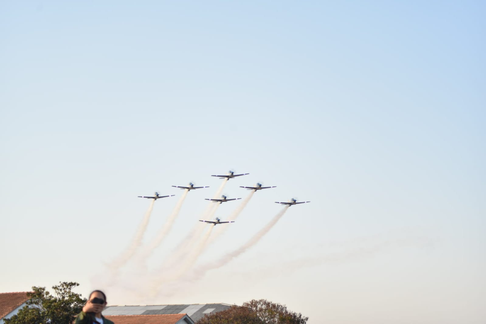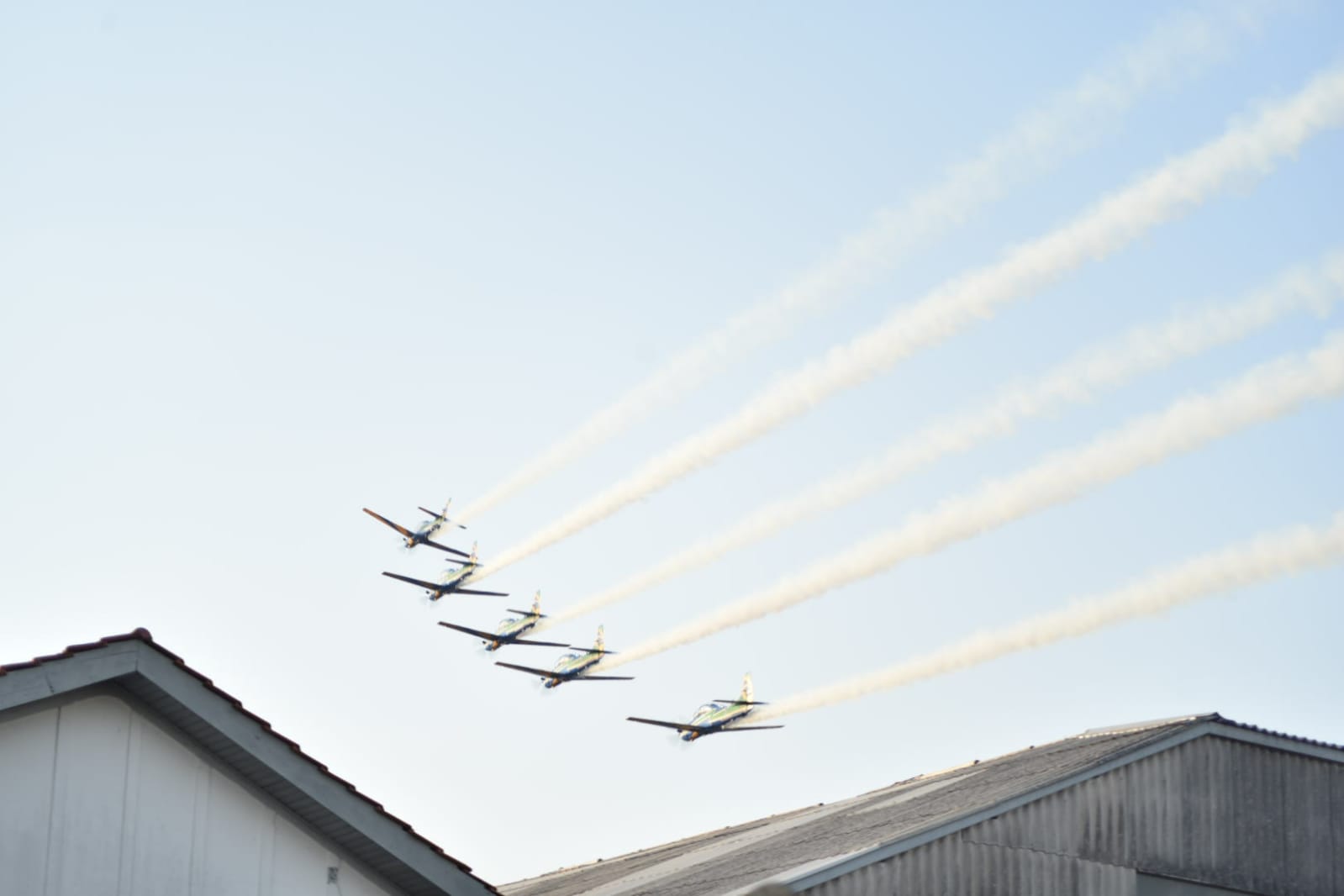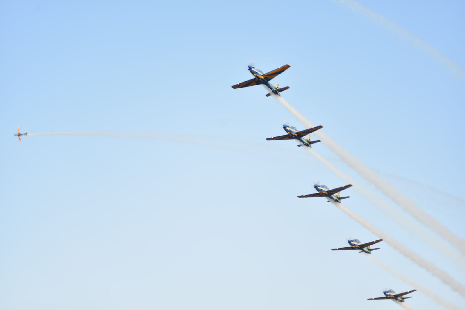 Esquadrilha da fumaça durante manobras em Curitiba nesta sexta-feira (20). Foto: Força Aérea Brasileira / divulgação.