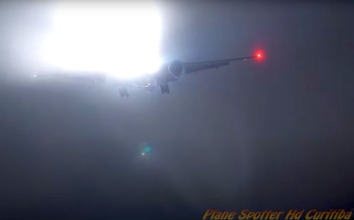 Por entre a neblina, surge um Boeing 777F Cargo da Lufthansa, empresa aérea alemã. As luzes ofuscam a visão do espectador e o barulho das turbinas fazem a trilha sonora da passagem da aeronave por cima da equipe de filmagem, que consegue o registro com detalhes incríveis. O avião, de matricula D-ALFF estava prestes a encerrar uma jornada de 12 horas no ar.