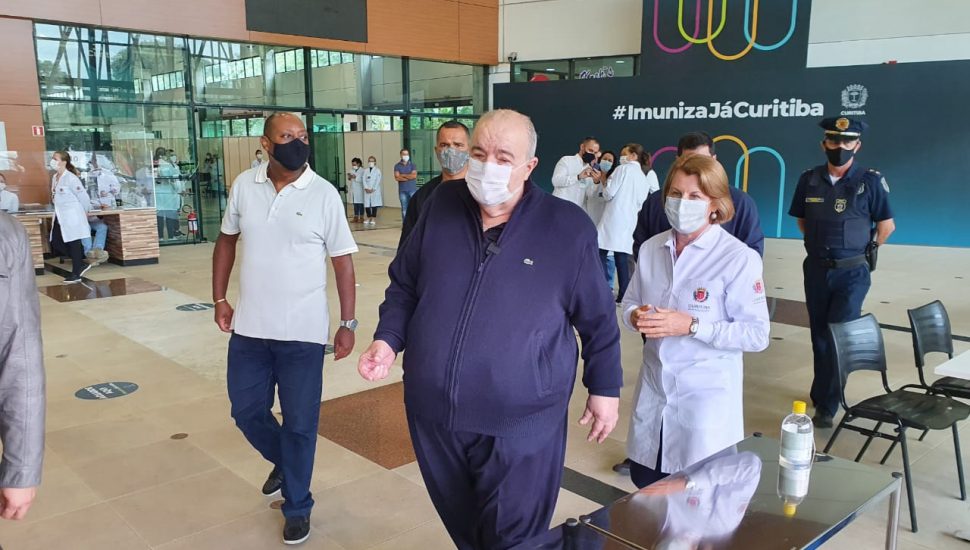 O prefeito Rafael Greca esteve no Pavilhão da Cura do Parque Barigui, neste sábado (17), em Curitiba, para tomar a primeira dose da vacina contra o coronavírus. Com a chegada de novos lotes da vacina enviados pelo MInistério da Saúde, idosos com 65 anos foram autorizados a receber o imunizante. É o caso de Greca.