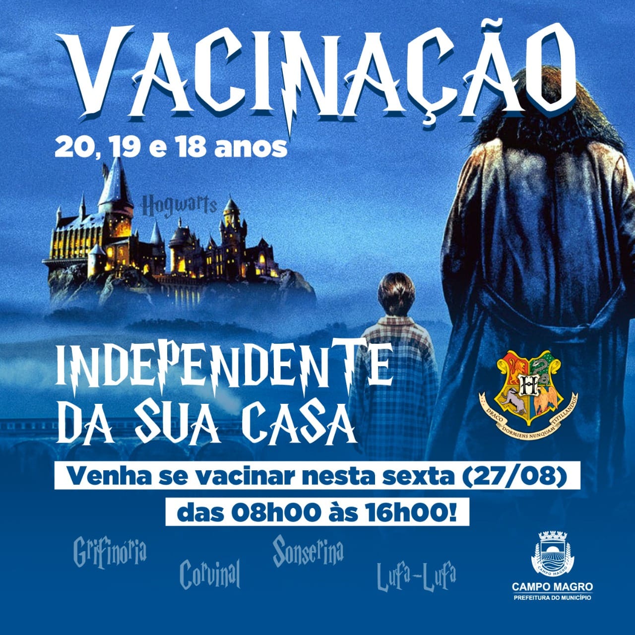 A cidade de Campo Magro, na região metropolitana de Curitiba, vai começar a vacinar jovens com 18, 19 e 20 anos contra o coronavírus. Para chamar a atenção dos homens e mulheres desta faixa etária, lançou mão de uma estratégia curiosa em suas redes sociais. Com uma arte que remete aos filmes da série Harry Potter, fez o convite inusitado para a imunização contra a covid-19.