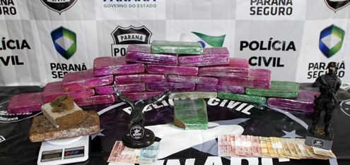 Policiais civis da Divisão Estadual de Narcóticos (Denarc) prenderam, na noite de quarta- feira (22), Douglas Gonçalves Juvenal, 19 anos, o “Maninho”, Henrique dos Santos Junior, 21 anos, o “Juninho”, e Jean Pierre Ferreira de Oliveira, 24 anos, com 24,4 quilos de maconha, uma balança de precisão e R$ 650,00 em dinheiro, no Jardim das Graças, em Colombo.