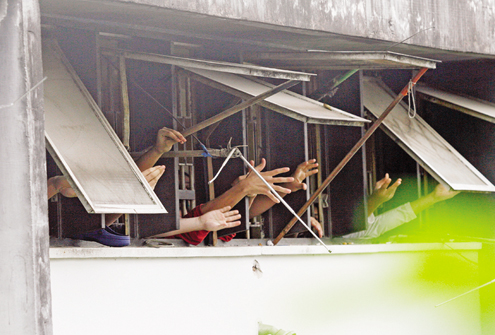 Pouco depois das 9h30, os policiais da DFRV souberam que os presos estavam serrando as grades. Diante da denúncia, todos os presos foram tirados das celas, para que a cadeia fosse revistada. Os policiais encontraram grades serradas e uma serra foi recolhida. Quando os presos eram colocados de volta nas celas, mais amontoados do que antes, já que os cubículos com grades cortadas foram isolados para reparos à tarde, começou a barulheira.