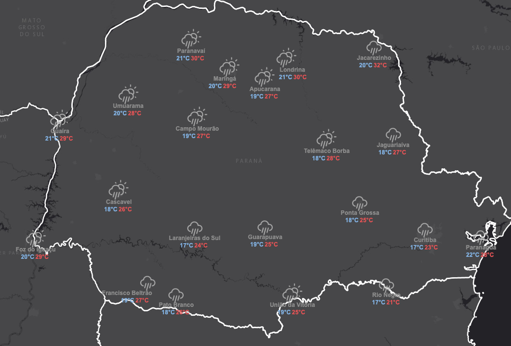 Com essa atual condição atmosférica, o tempo fica mais ameno em todo o Estado. Apesar disso, no litoral, que vinha tendo bons dias de sol e calor, os termômetros se elevam um pouco: a máxima pode chegar aos 28ºC em Paranaguá. A maior temperatura do dia deve ser em Jacarezinho, onde faz 32ºC. Veja a previsão para todo o Paraná: