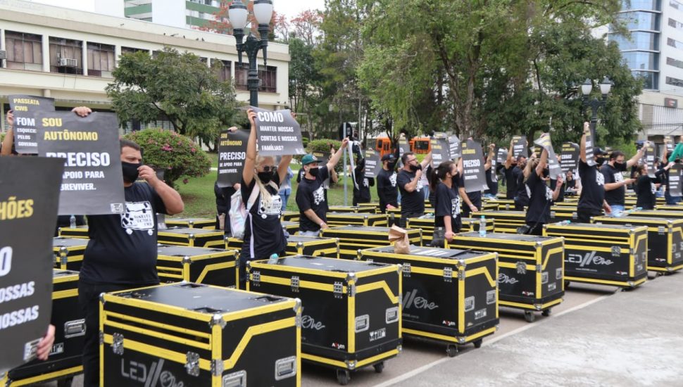Cerca de 200 profissionais de promoção, eventos e donos de agências e empresas ligadas ao setor de shows e espetáculos fizeram, na manhã desta terça-feira (8), um protesto na frente do Palácio 29 de Março, sede da Prefeitura de Curitiba. Representantes de um dos setores mais atingidos pela pandemia do novo coronavírus, os manifestantes firmaram sua posição de insatisfação contra o que classificam como abandono da categoria.