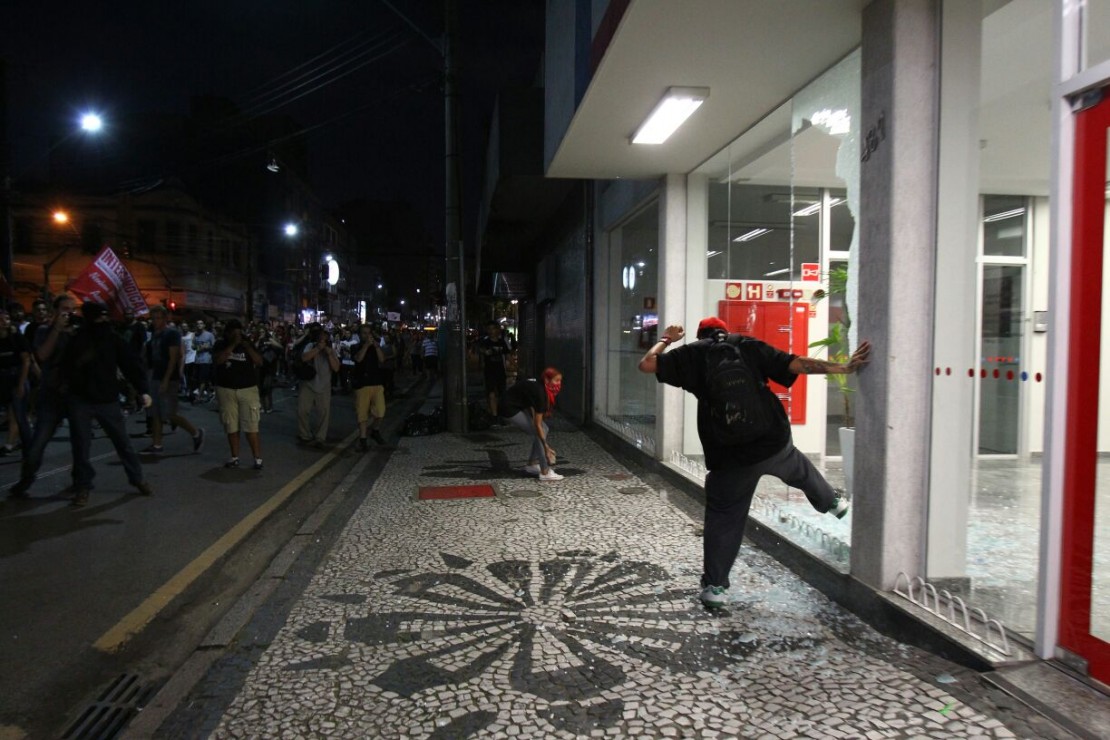 O protesto contra o aumento da passagem de ônibus em Curitiba na noite desta segunda-feira (6) registrou atos de vandalismo. Mascarados estavam infiltrados entre os manifestantes. Houve pichações a prédios públicos e particulares, os vidros de uma agência bancária foram quebrados e ainda invasões de estações-tubos.