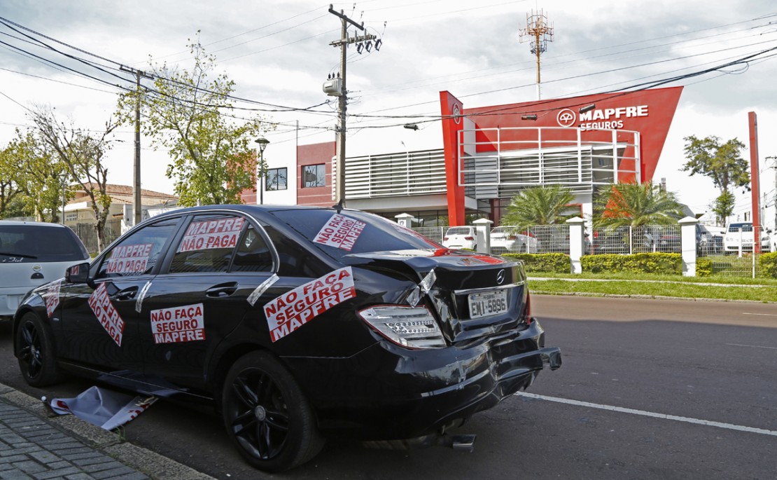 Uma Mercedes cheia de adesivos protestando contra a seguradora Mapfre está chamando a atenção de quem passa pela esquina da Avenida Comendador Franco com a Rua Brasilio Itiberê, no bairro Jardim Botânico, em Curitiba. Estacionado em frente ao posto de atendimento da Mapfre desde a noite desta quinta-feira (10), o carro – que está todo batido – foi coberto por decalques com os seguintes dizeres: “Mapfre não paga!” e “Não faça seguro com a Mapfre!”.