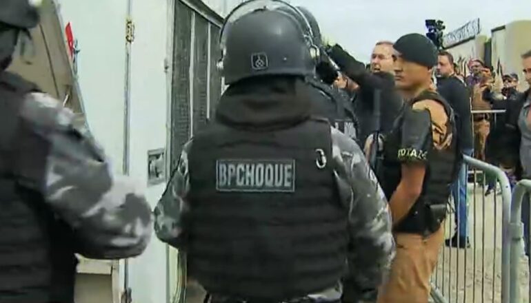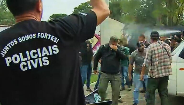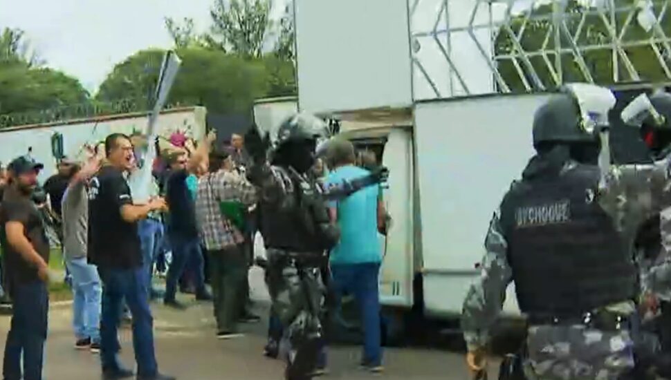 Um protesto de servidores da Polícia Civil do Paraná terminou em confusão na manhã desta segunda-feira (11), em Curitiba. A manifestação aconteceu no bairro Tarumã, na sede do Departamento de Trânsito do Paraná (Detran-PR), durante a inauguração do chamado Detranzinho, aquela mini cidade educativa. A tropa de choque da Polícia Militar (PM) precisou ser acionada após uma troca de empurrões entre a segurança do evento e os manifestantes. Segundo o que apurou a Tribuna do Paraná, os policiais civis tentaram estacionar um carro de som em frente ao local, mas foram impedidos pela PM, que realizava a segurança do evento. O evento contou com a presença do governador Ratinho Jr.