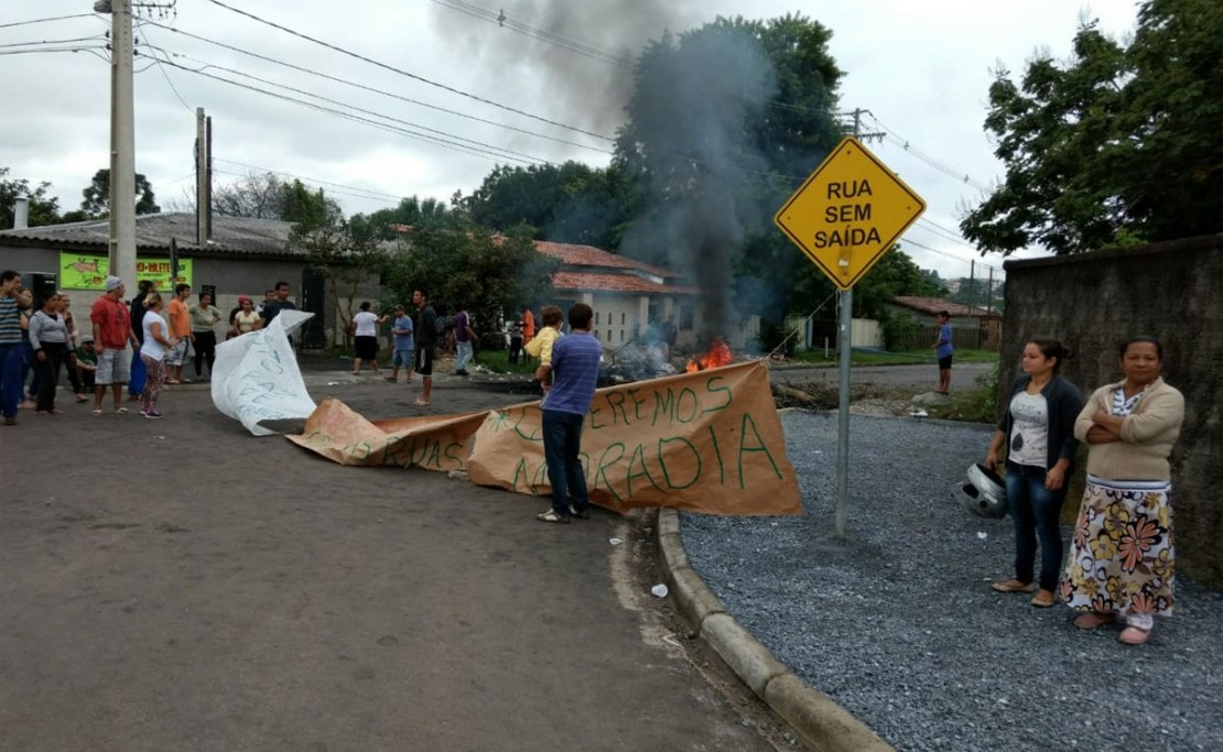 Mobilizados cobrando por moradia, pelo menos 60 famílias bloqueiam a Rua Paulo Turkiewicz, no Bairro Tarumã, em Curitiba, desde o começo da manhã desta sexta-feira (22). As pessoas protestam contra uma ordem judicial que prevê a retirada de cerca de 30 destas famílias de um terreno ocupado.