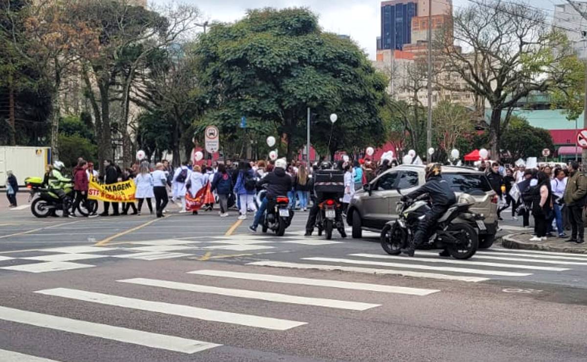 Além do congestionamento na região da Praça Rui Barbosa, o protesto dos enfermeiros afeta a redondeza da Santa Casa de Curitiba. Avenida Visconde de Guarapuava e Travessa Frei Caneca estão com fluxo complicado.