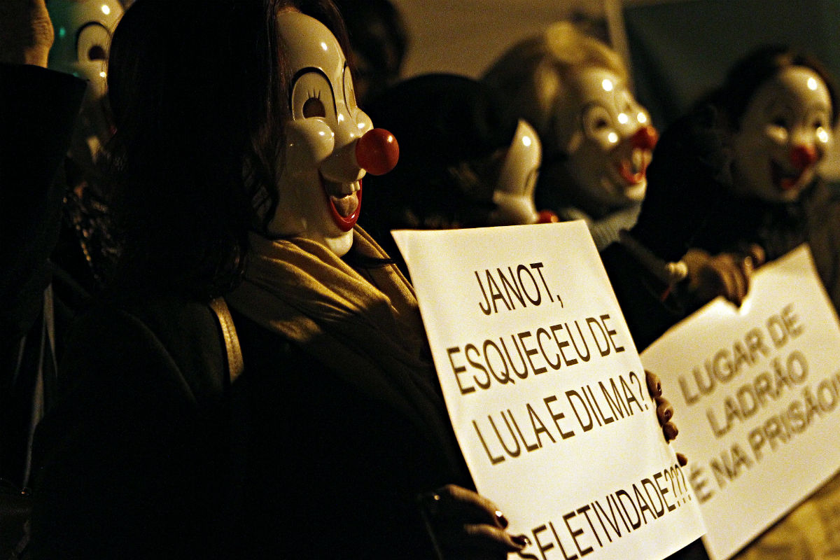O segundo grupo usava máscaras de palhaços para representar a população brasileira, segundo os organizadores. Durante a encenação, os ministros e os políticos abriram uma garrafa de champanhe e brindaram em frente aos representantes da sociedade. “É para simbolizar a festa dos poderosos em cima da população”, explicou uma manifestante, que estava com a máscara da ex-presidente Dilma.