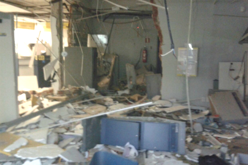A cidade de Cerro Azul, 90 km ao norte de Curitiba, foi dominada por um grupo criminoso no fim da madrugada desta quinta-feira (6), que acuou policiais e explodiu caixas eletrônicos dentro da agência do Banco do Brasil e do Bradesco, que ficaram destruídas.