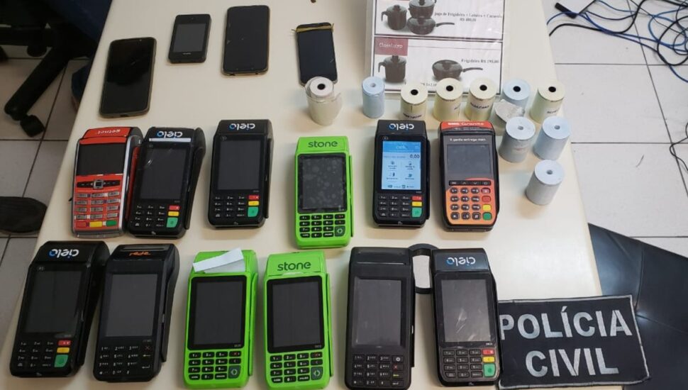 Alvos dos mandados de prisão usavam máquinas de cartão de crédito para aplicar golpe de porta em porta. Foto: Polícia Civil.