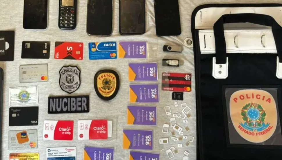 A Polícia Civil do Paraná (PCPR), em apoio à Polícia do Senado Federal, apreendeu celulares, cartões de crédito e chips durante ação de cumprimento de mandado de busca e apreensão deflagrada nesta quarta-feira (2), em Curitiba. A quadrilha é suspeita de aplicar golpes que ultrapassam R$ 2 milhões contra políticos.