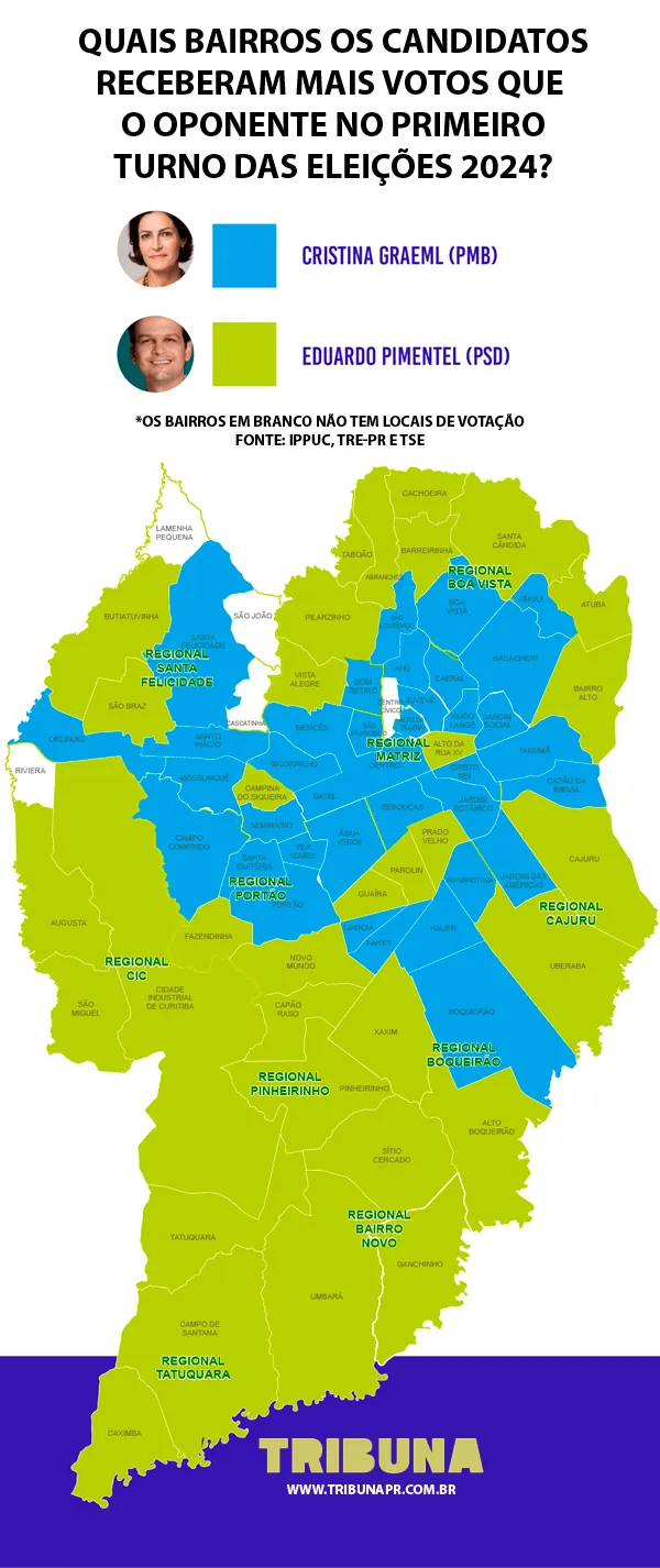 Em alguns bairros a diferença de votos na eleição do primeiro turno foi muito pequena entre Eduardo Pimentel (PSD) e Cristina Graeml (PMB). Já em outros, um teve uma votação expressiva em detrimento do outro. Para o segundo turno, por exemplo, Cristina Graeml terá que focar sua campanha em bairros como Cidade Industrial de Curitiba (CIC), Sítio Cercado, Tatuquara, Uberaba, Cajuru, Xaxim, entre outros, onde Eduardo Pimentel teve boa votação (veja mais abaixo)