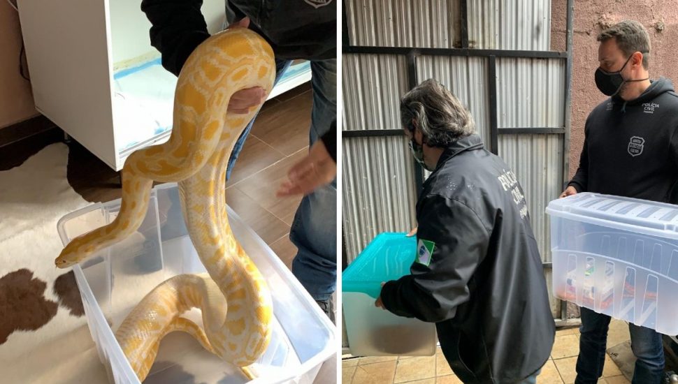 Quatro cobras foram resgatadas na manhã desta quarta-feira (29) pela Polícia Civil do Paraná, em uma casa na Cidade Industrial de Curitiba. São três répteis da espécie corn snake e outra píton albina de três metros. Um homem foi autuado em flagrante por manter animal silvestre em cativeiro. As cobras eram mantidas pelo homem como hobby.