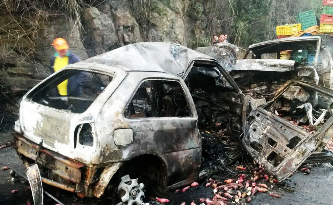 Com o impacto entre os dois veículos, houve uma explosão e tanto o carro, com placas de Quitandinha, quanto o caminhão, de Mandirituba, pegaram fogo.