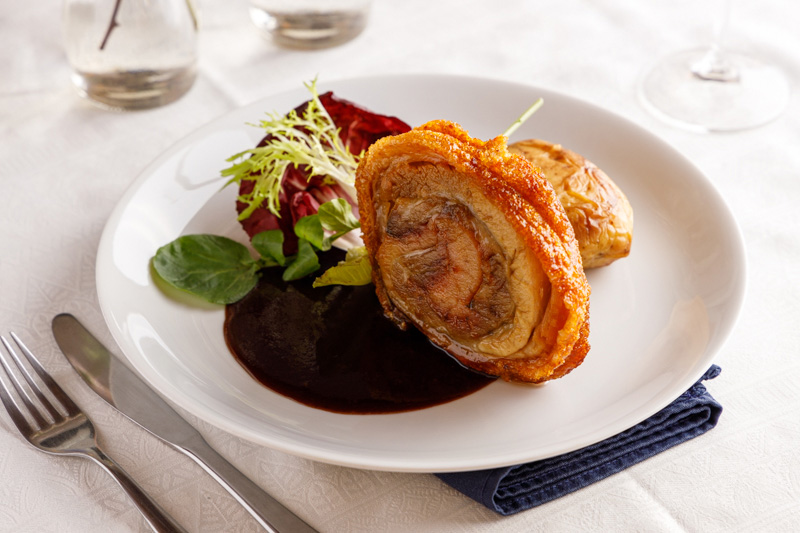 Porchetta marinada e assada lentamente com batata assada, molho de ameixa preta e salada, um dos pratos principais do Pescara Cucina Italiana.| Fernando Zequinão