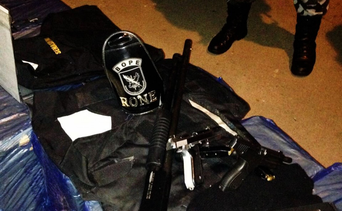 Durante as busca, os policiais encontraram uma espingarda calibre 12, duas pistolas calibre .40, e munições de calibre .40 e calibre 12.