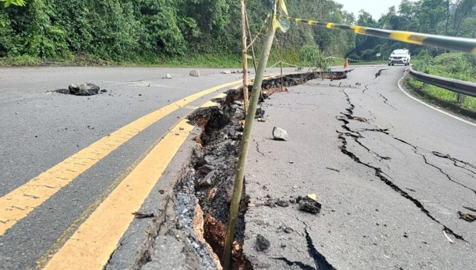 PR-092 em Rio Branco do Sul – Rachaduras no pavimento pioraram, levando ao bloqueio total da rodovia por risco de agravamento. DER/PR disponibilizou barreiras e está estudando as soluções para recuperar o pavimento e melhorias a curto prazo para retomar a trafegabilidade. Dano está localizado no km 48, rumo a Cerro Azul.