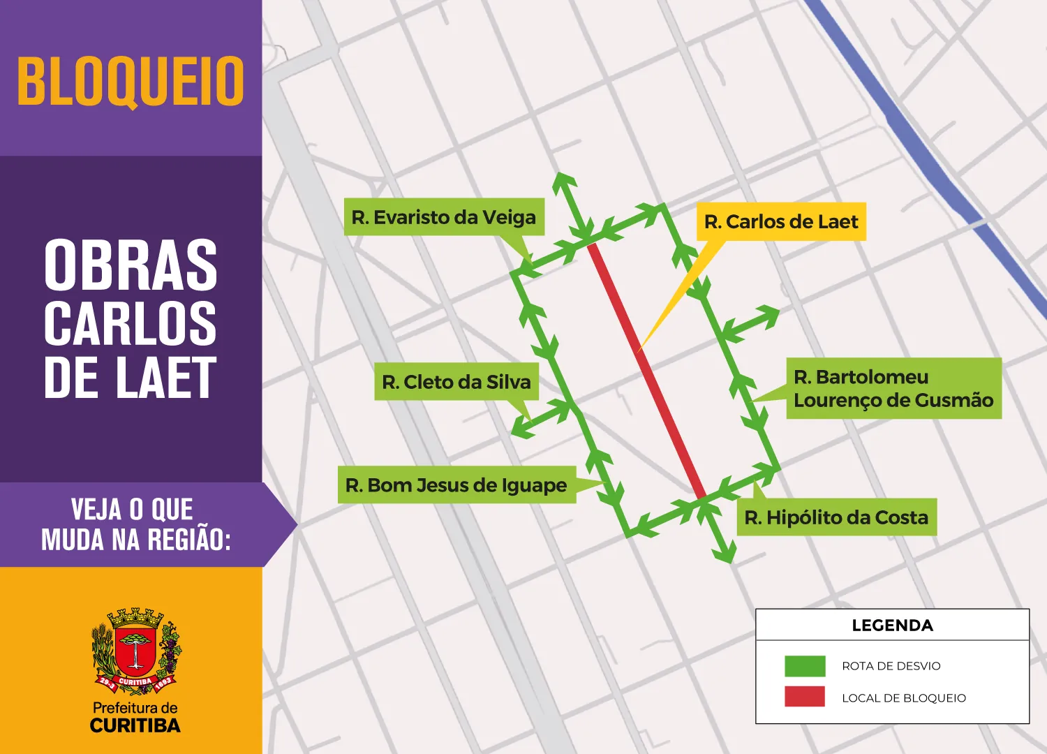 Os condutores que trafegam pela Rua Carlos de Laet no sentido norte encontrarão o cruzamento com a Rua Hipólito da Costa bloqueado. Como alternativa, poderão acessar a Rua Hipólito da Costa, à direita ou à esquerda, para chegar às ruas Bartolomeu Lourenço de Gusmão ou Bom Jesus de Iguape, seguindo até a Rua Evaristo da Veiga, por onde será possível retornar à Rua Carlos de Laet.
