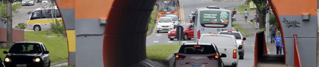 Rua de Curitiba com trânsito caótico desafia motoristas: semáforo, viaduto e muitas filas