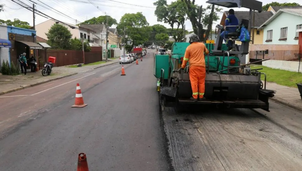 Imagem mostra uma obra de asfalto em Curitiba.