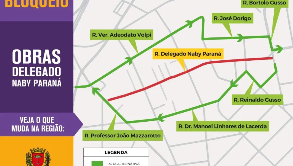 A partir desta segunda-feira (9/2), a Rua Deputado Naby Paraná, no bairro Capão Raso em Curitiba, será interditada entre as ruas Bortolo Gusso e Antônio Freitas Barbosa para obras do Novo Inter 2. O bloqueio, que deve durar cinco meses, permitirá intervenções de terraplanagem, drenagem, pavimentação, instalação de fibra óptica e construção de calçadas em um trecho de aproximadamente 680 metros.