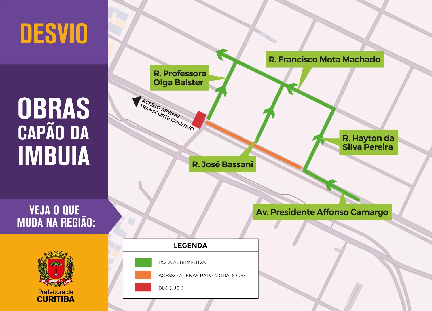 A partir desta quarta-feira (28/1), ruas do bairro Capão da Imbuia, em Curitiba, terão mudanças no trânsito devido às obras do novo terminal de ônibus. A Avenida Presidente Affonso Camargo será bloqueada entre as ruas Hayton da Silva Pereira e Professora Olga Balster a partir das 9h.