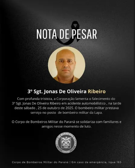 Jonas de Oliveira Ribeiro, 3º sargento do Corpo de Bombeiros Militar do Paraná, foi uma das vítimas de um acidente fatal registrado neste sábado (25/10) na BR-476, em Araucária, na Região Metropolitana de Curitiba (RMC). Ele estava acompanhado da esposa, Rita de Cássia Padilha, de 45 anos, e do neto, de cerca de dois anos.