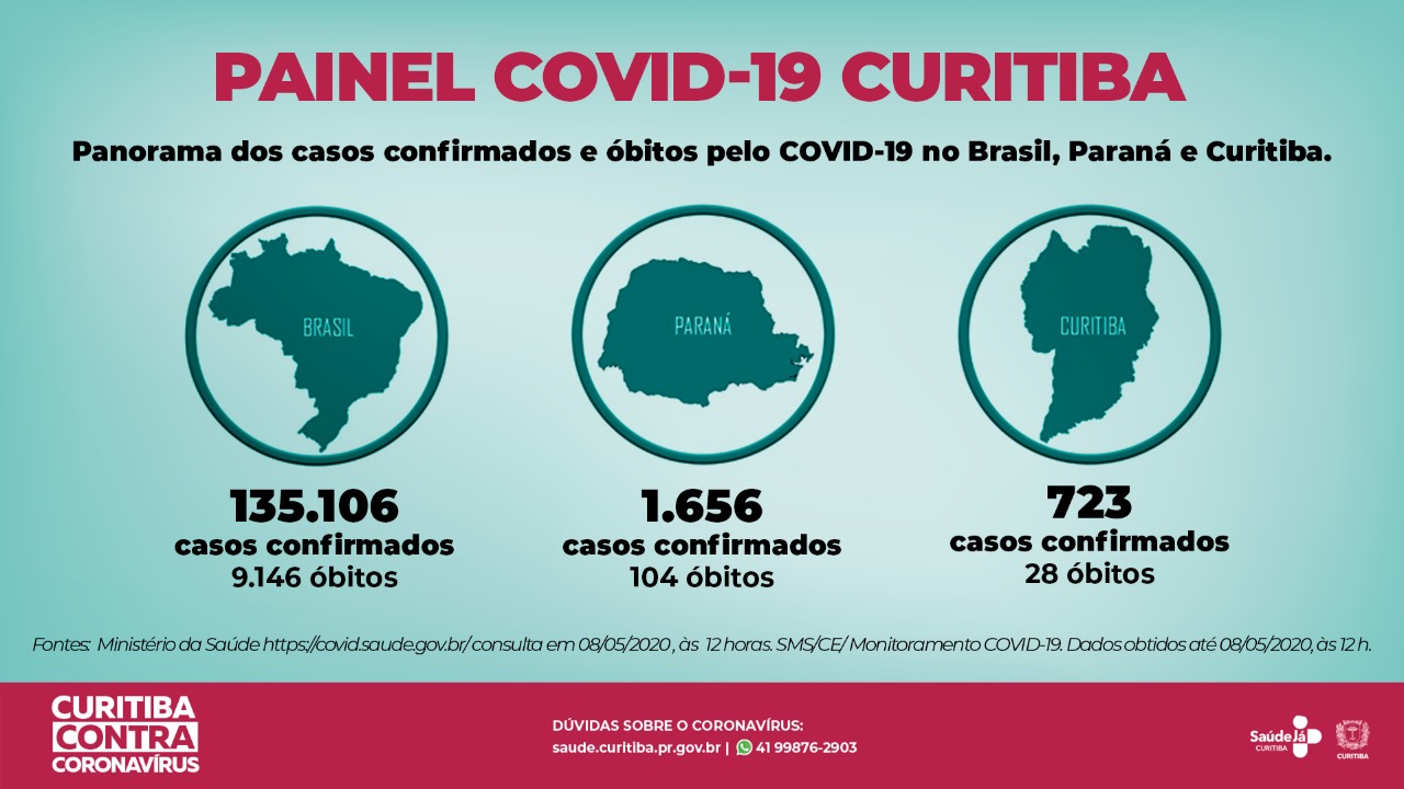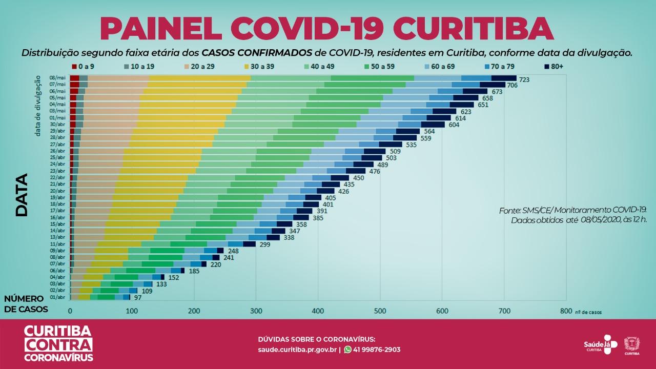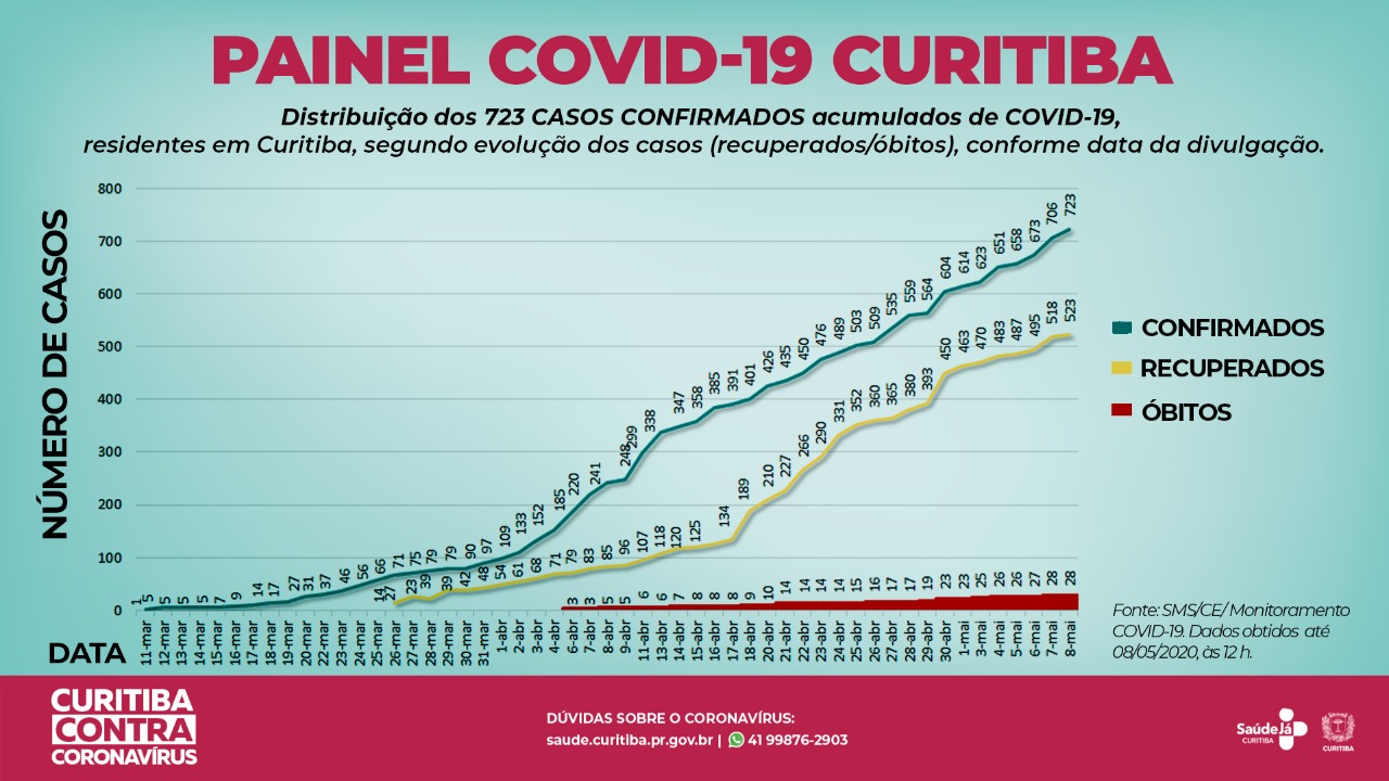 Com 17 novas confirmações, chega a 723 o total de casos de novo coronavírus em Curitiba. Nas últimas 24 horas, nenhuma morte foi registrada na capital, permanecendo em 28 o número de óbitos em decorrência da covid-19. Dos pacientes infectados, 523 já estão recuperados e foram liberados do isolamento social. Os dados fazem parte do boletim divulgado pela Secretaria Municipal de Saúde (SMS) na tarde desta sexta-feira (8).