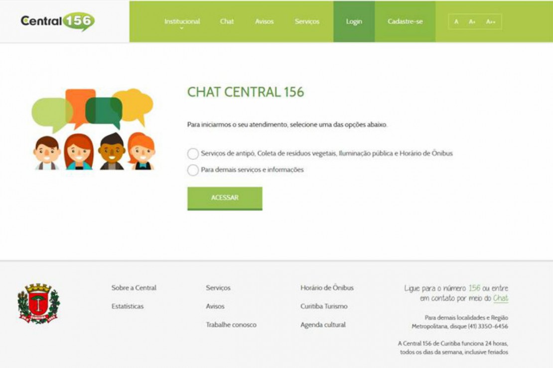O serviço 156 de Curitiba está disponibilizando uma nova modalidade de atendimento ao cidadão curitibano dentro do portal do sistema (www.central156.org.br), um chat automatizado, no qual as demandas de serviços são direcionadas diretamente às secretarias responsáveis, sem passar por atendentes.