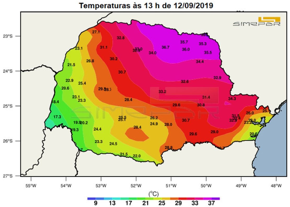 O Sistema Meteorológico do Paraná (Simepar) anunciou que esta quinta-feira (12) foi registrado o dia mais quente deste inverno em Curitiba. No meio do dia os termômetros marcaram 32,9ºC. Na região Norte do Paraná o “bicho pegou” mais forte. No Alto do Paranapanema as temperaturas oficiais superaram os 35ºC.