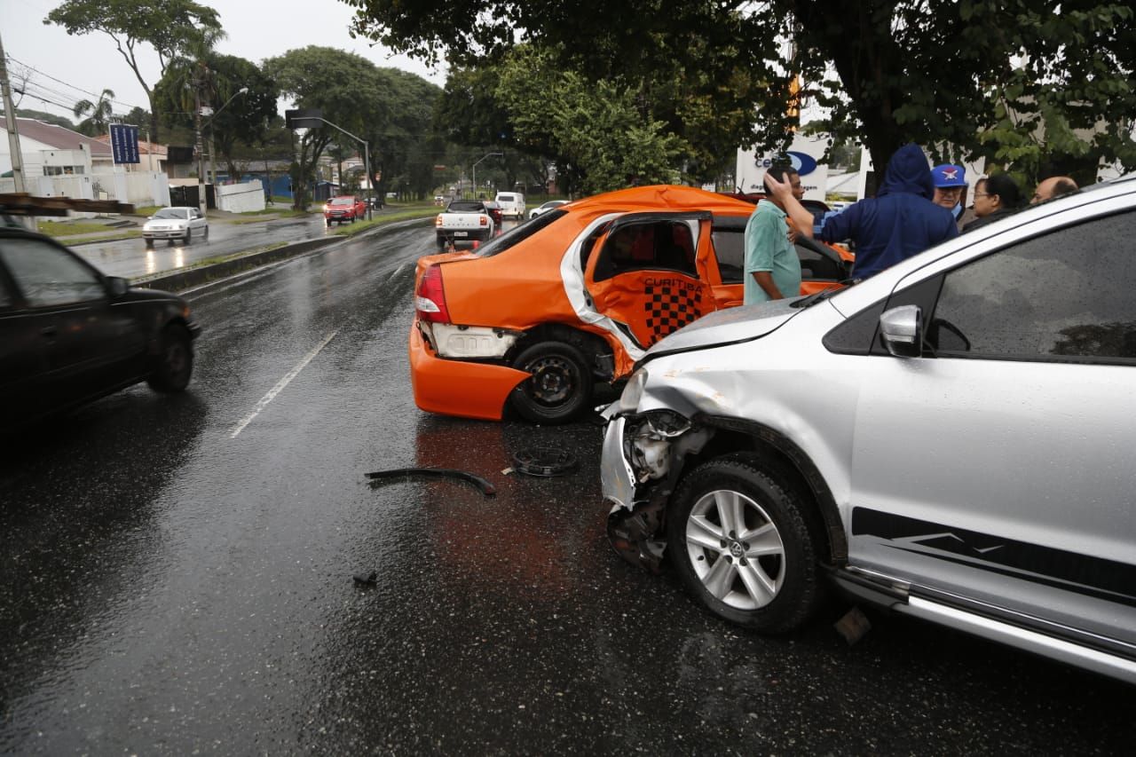 Uma colisão entre dois veículos neste sábado (11) no bairro do Tarumã, em Curitiba, comprovou o perigo de se trafegar em alguns momentos na Avenida Victor Ferreira do Amaral, na proximidade do Hospital das Nações. Um táxi Etios Toyota estava no sentido Centro quando se perdeu na via e atravessou a mureta. Com a pista molhada devido a chuva, o CrossFox Cinza que estava no sentido Pinhais bateu na lateral do táxi.