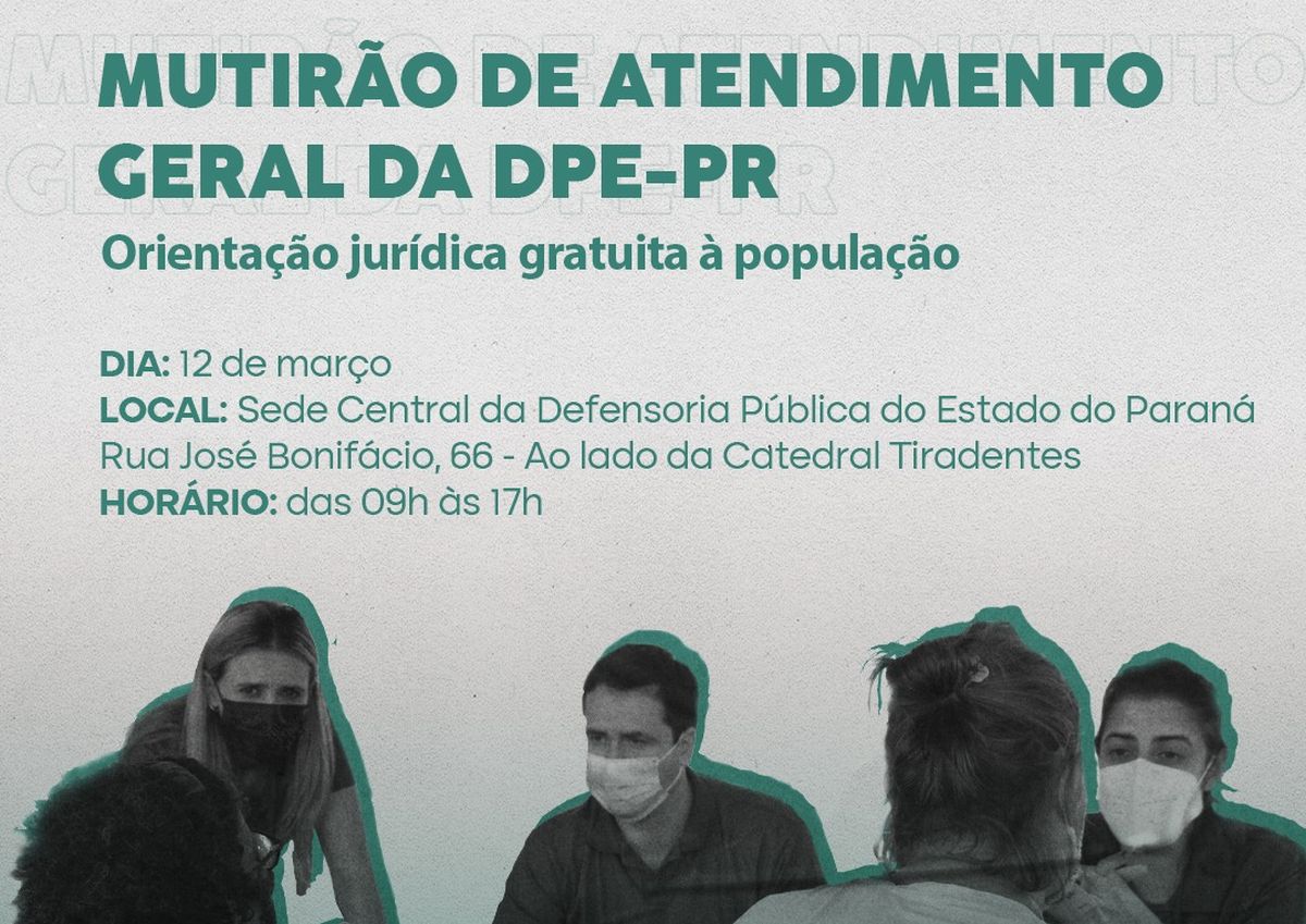 A Defensoria Pública do Estado do Paraná (DPE-PR) vai abrir suas portas neste sábado (12), no Sede Central de Curitiba, para atender a população em um grande mutirão geral de orientação jurídica. A iniciativa faz parte de um mutirão nacional idealizado pelo Conselho Nacional dos Defensores e Defensoras Públicas-Gerais (Condege) que será promovido no sábado por todas as Defensorias país afora.