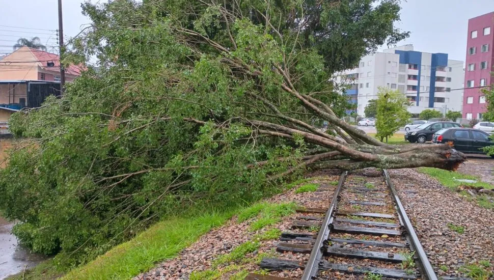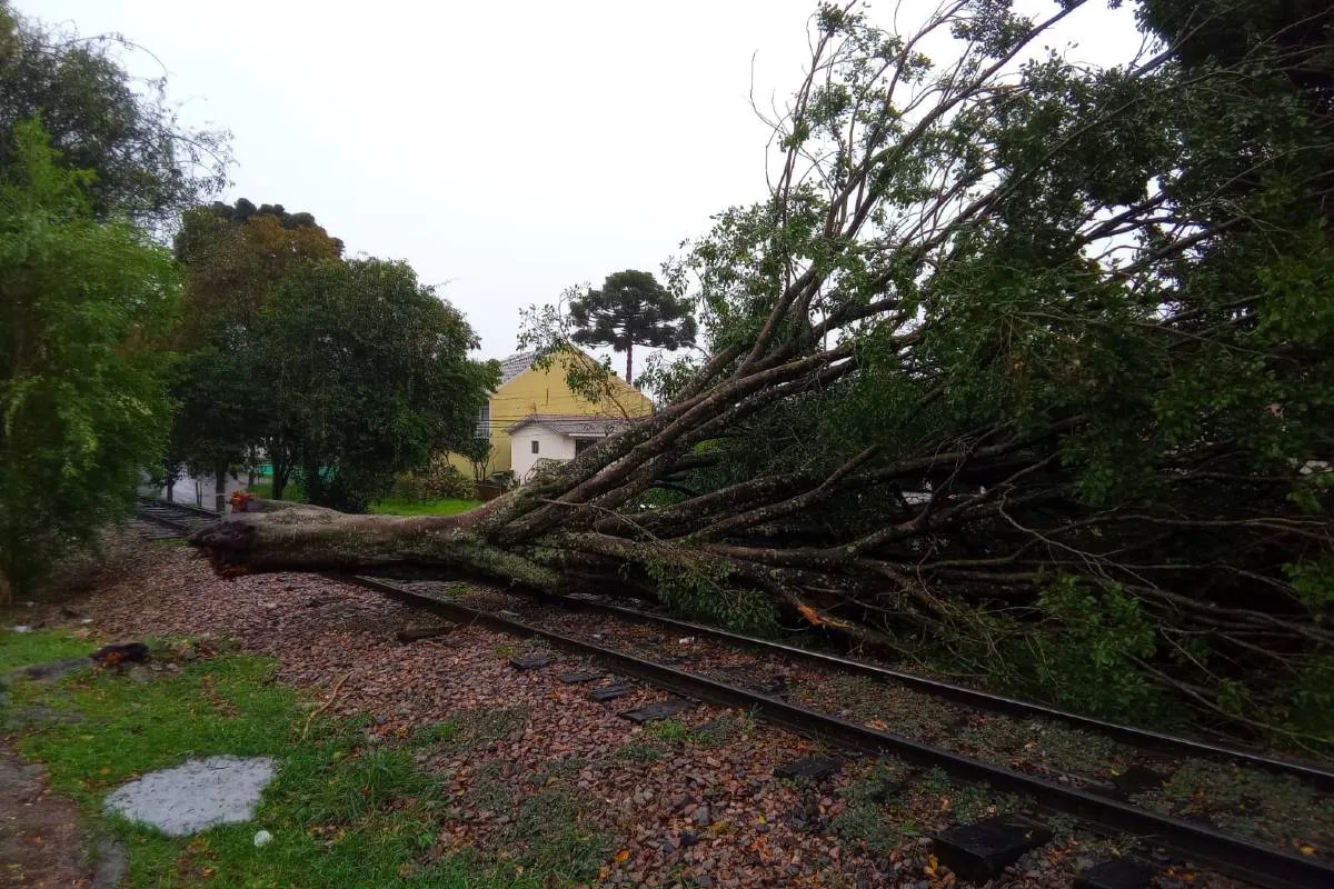Uma árvore de grande porte desabou sobre a linha férrea no bairro Cabral, em Curitiba, na manhã desta segunda-feira (22). A queda, que foi provocada pela força dos ventos intensos e pelo volume de chuva acumulado, ocorreu na esquina da Rua Santo Afonso de Ligório com a Rua Coronel Amazonas Marcondes, em um trecho próximo a um posto de combustíveis.
