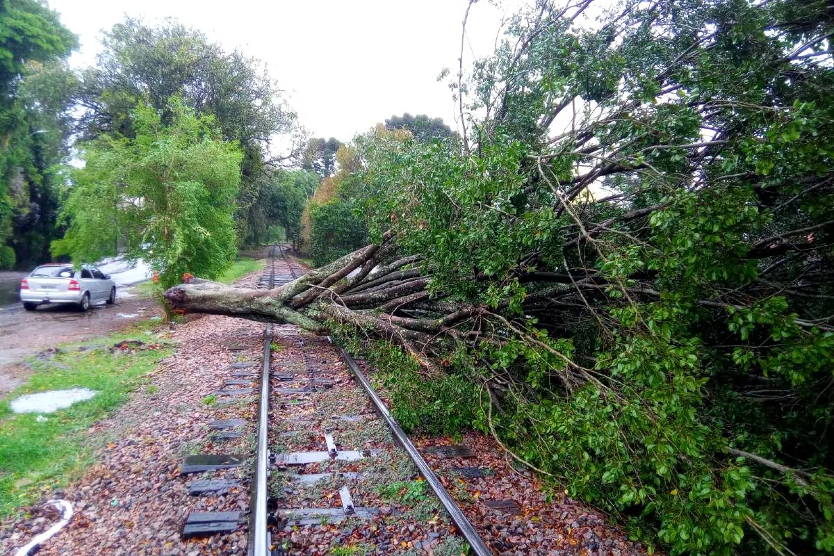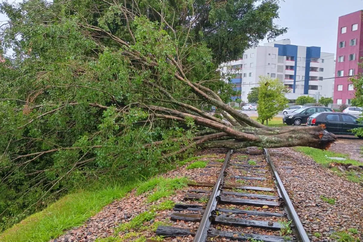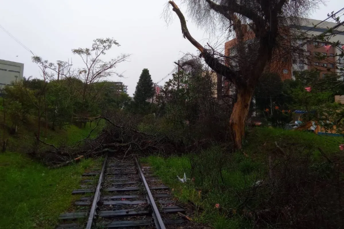 A poucos metros dali, outra árvore também caiu sobre a ferrovia, e por pouco os galhos não atingiram veículos que estavam estacionados na região. Confira, abaixo, imagens de como ficou a região: