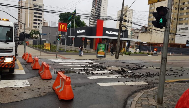 No Centro de Curitiba, na esquina entre a Avenida Visconde de Guarapuava e Rua Desembargador Westphalen, a forte chuva chegou a destruir parte do asfalto. Uma equipe do Setran foi até o local e o trecho está temporariamente interditado.