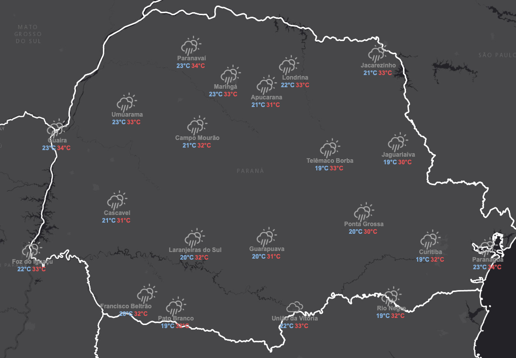 No litoral, os termômetros apresentam ainda mais elevação do que em Curitiba e RMC. Em Paranaguá, por exemplo, pode fazer 34°C. Nas cidades litorâneas, porém, a chuva não deve marcar presença com tanta força nesta terça-feira. Veja a previsão para todo o Paraná: