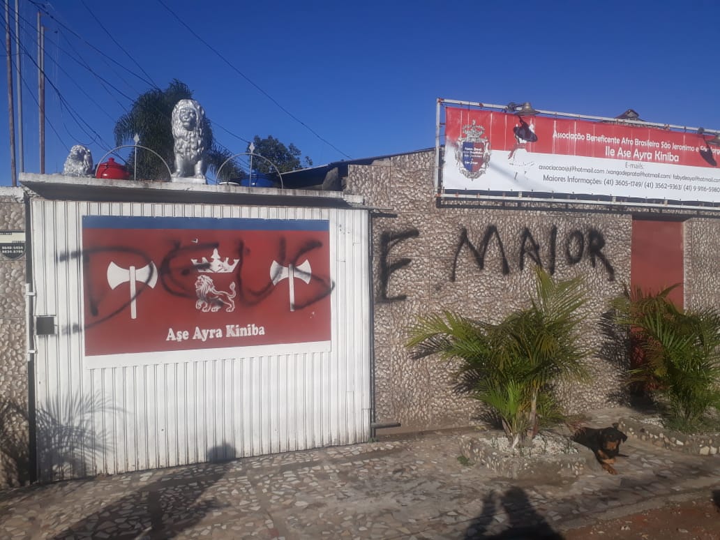 Um terreiro de Candomblé foi alvo de vandalismo e intolerância religiosa quarta-feira (1º), em Colombo, na região metropolitana de Curitiba. A casa teve a fachada pichada com a frase “Deus é maior” e os vândalos ainda jogaram uma bíblia e uma garrafa pet com mensagens de ódio: “seu lugar é na a senzala, escravo do diabo”, “o sangue de Jesus tem poder”, “pecador, vai embora”, entre outras.