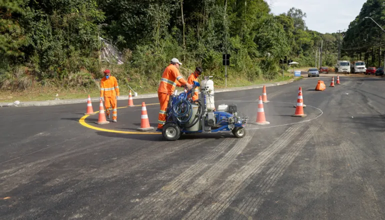 A região também ganhou uma nova rotatória. Conforme o município, para reduzir conflitos no trânsito, a estrutura inicialmente é feita com sinalização e, após a conclusão dos serviços em andamento, será substituída por uma rotatória em formato de “pires invertido”, com o centro rebaixado, para que os carros circulem normalmente e veículos grandes, como ônibus e caminhões, consigam passar sem dificuldade.