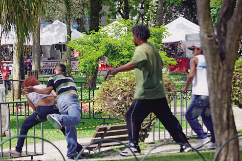 A briga entre dois usuários de drogas prendeu a atenção de quem passava pela Praça Santos Andrade, Centro, por volta das 16h de ontem. Estendido na grama, um grupo de moradores de rua tirava uma soneca ao sol. Um rapaz de camiseta listrada passou e mexeu com os que dormiam, tentando acordá-los.
