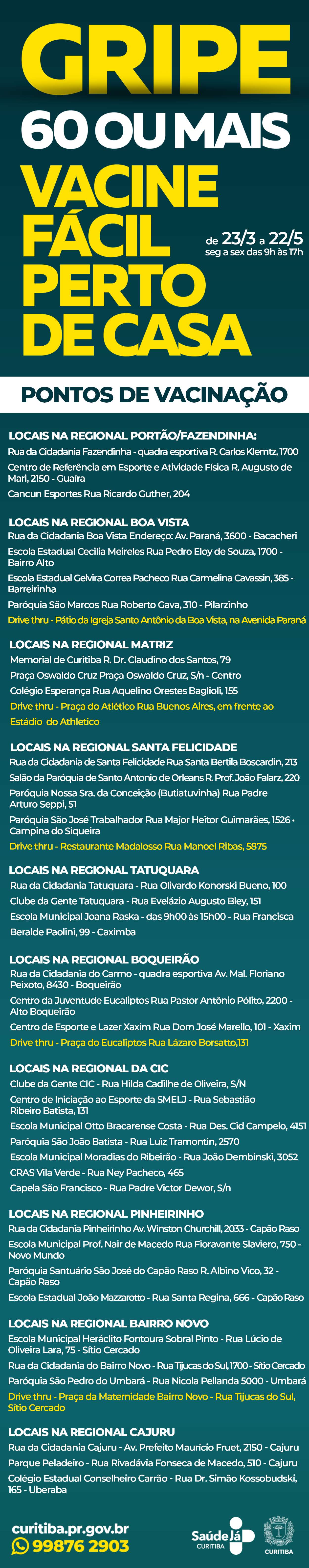 A prefeitura de Curitiba vai adotar o sistema de drive thru em cinco pontos da cidade para a vacinação contra a gripe, que inicia nesta segunda-feira (23). A ideia é diminuir aglomerações nas unidades de saúde para evitar a possibilidade de infecção pelo novo coronavírus. No total, são 42 pontos externos, que irão funcionar de segunda a sexta-feira, das 9h às 17h. A ação é realizada pela Secretaria Municipal da Saúde, em parceria com a Secretaria Municipal de Defesa Social e Trânsito.