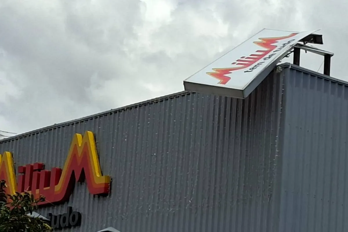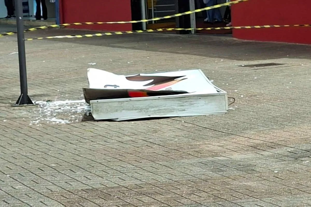 Em São José dos Pinhais, a placa de uma loja despencou em pleno Calçadão da Rua XV. Felizmente ninguém foi atingido.