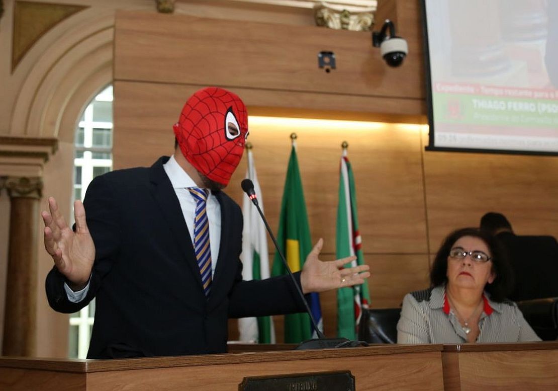 Ao saber de mais um arrastão no transporte coletivo de Curitiba, o vereador Thiago Ferro (PSDB) tomou a palavra nesta segunda-feira (2), no plenário da Câmara dos Vereadores, para criticar o projeto da prefeitura de monitoramento dos ônibus como única medida pra prevenir ações violentas de bandidos. Ferro vestiu uma máscara de Homem-Aranha para mostrar que o simples adereço comumente utilizado em festas infantis é suficiente para driblar a “solução” apresentada pela administração do prefeito Rafael Greca.