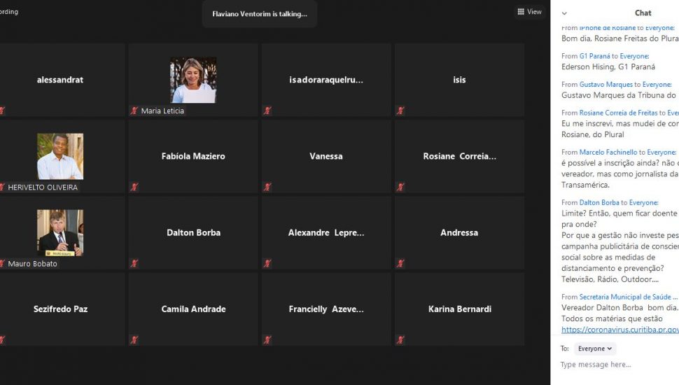 No chat, campo escolhido para as inscrições das perguntas, o vereador Dalton Borba retrucou algumas respostas. Durante a explanação da Beatriz Battistella Nadas, superintendente Executiva da SMS, ele postou: “Limite? Então, quem ficar doente corre para onde? Por que a gestão não investe pesado em campanha publicitária de conscientização social sobre as medidas de distanciamento e prevenção?”.