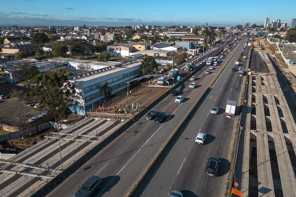 Após a concretagem desta e das demais lajes da superestrutura, serão executadas as barreiras de proteção em concreto, as demais camadas de pavimentação, sendo a última em asfalto, e a implantação das calçadas para pedestres. A próxima etapa de concretagem ocorrerá na Via Marginal Esquerda, no sentido Curitiba.