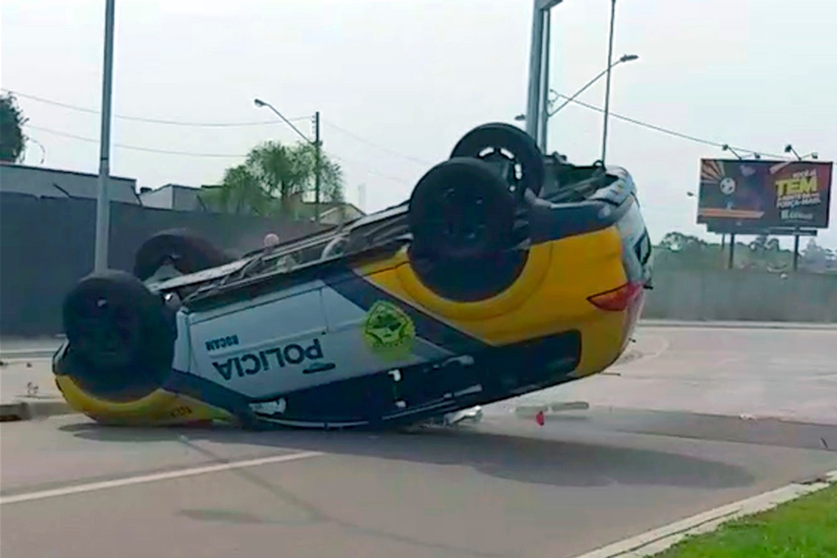 O capotamento de uma viatura da Polícia Militar (PM) foi registrado em vídeo, na tarde desta quarta-feira (9), por motoristas de Curitiba que aguardavam o semáforo abrir na Rua Konrad Adenauer, no Tarumã, na altura do número 1166. O acidente ocorreu quando equipes de policiais militares saíam do Regimento de Polícia Montada Coronel Dulcídio da PM-PR para uma operação de patrulhamento de rotina. Dois vídeos, de ângulos diferentes, mostram o exato momento em que a viatura da Ronda Ostensiva com Apoio de Motocicletas (Rocam) se perde em um trecho da via, logo após sair de uma rotatória.